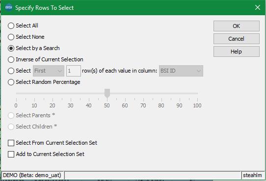 There are many points throughout the workflow process where a user may want to apply processing tasks, assign data or report on a particular subset of specimens in an editor. Manually selecting the desired specimens may not be a daunting task when the batch contains only 10 or 20 records, however, batches often contain many hundreds or thousands of specimens. In this case, selecting records by hand can be frustrating and highly inefficient. BSI's Select Rows tool helps to streamline this process by highlighting rows according to user defined criteria.